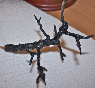 Realizadas estas operaciones, por supuesto con la masilla ya seca, pinto o doy imprimación negra al árbol, de esta forma, se consigue una excelente base de color para sacar después interesantes luces y sombras. Es aconsejable antes de dar la imprimación y con la masilla todavía húmeda hacer unos surcos en el tronco a modo de grietas esto simulara muy bien el tronco de un árbol,  para esta operación un punzón fino o un palillo de madera servirá.