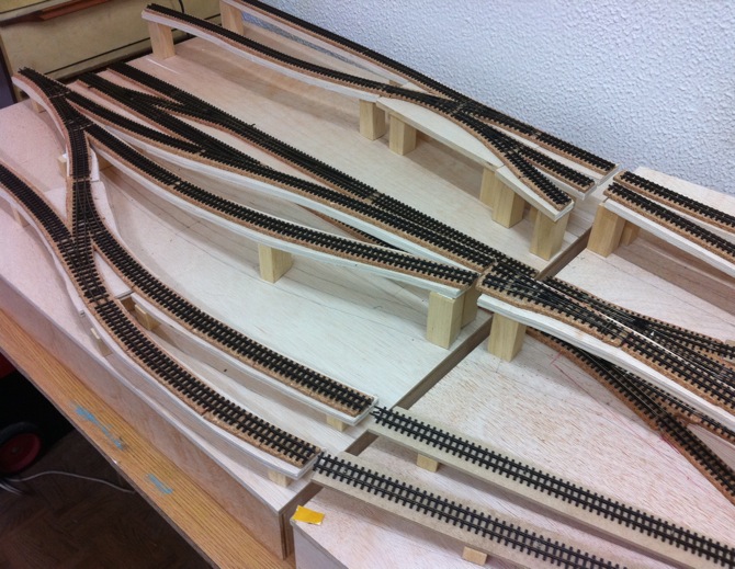 Tan importante como disponer de unas buenas vías es su colocación sobre la base que las va a sustentar, es decir, la plataforma a la que una vez dispuesta la añadiremos el balasto. Cuando hablo de plataforma me refiero al terraplén y al lecho de balasto que va encima formando el talud sobre el cual ira colocada la vía. De momento presentamos las vías de que va a constar nuestro circuito sobre las plataformas o estructuras de madera que anteriormente habíamos dispuesto.