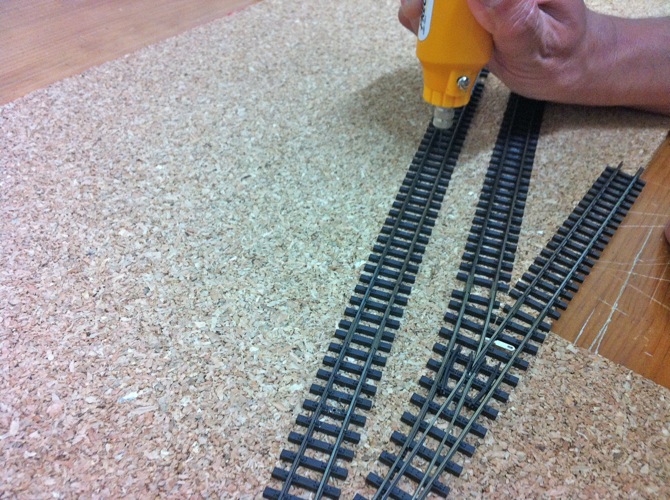 Colocados los lechos de corcho convenientemente sobre la estructura, implantaremos sobre ellos las correspondientes vías las cuales formaran el circuito. Esta operación la podremos hacer clavando las vías sobre el corcho, estas que he elegido al no llevar los correspondientes orificios sobre las traviesas, se los tendré que hacer, para ello una mini broca de 1 mm me servirá con la que taladrare la traviesa que me interesa después las colocare en su sitio y las fijare por medio de unos clavitos pero sin clavarlas totalmente, simplemente las situare ya que al tratarse de modulos habra que hacer ajustes. Observar las dos fotografías que ilustran esta explicación.