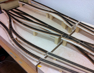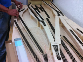 Una vez realizadas las operaciones anteriores, es decir, preparación, corte y comprobación presentamos dichos tramos ya acondicionados junto con los correspondientes desvíos o cambios de agujas sobre nuestras estructuras, comprobando así su perfecta disposición sobre ellas y seguir sin problemas los pasos que vendrán a continuación.