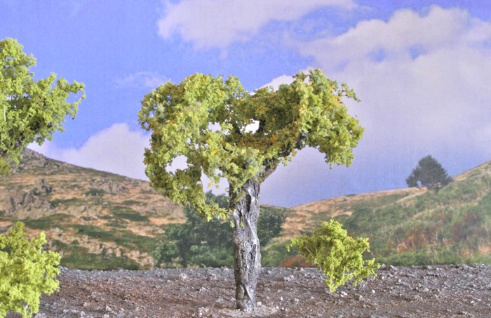 Dos vistas de la superficie ya acabada y tratada convenientemente, en la imagen inferior se observa que se ha encuadrado un bastidor de fondo, de esta forma se obtendrá una mejor perspectiva, así como, una profundidad y realismo muy interesantes, también se han colocado unos arboles y algún que otro matorral, así conseguiremos mejores acabados y conjuntos mas apropiados.