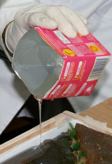Mezclados adecuadamente los componentes anteriormente citados, nos deberemos fijar en las instrucciones dadas por el fabricante del producto adquirido, y como es obvio realizada dicha mezcla en un recipiente destinado para este fin, verteremos la resina sobre la base o lecho ya preparado, en este caso podemos observar que he realizado un dique en la zona tratada para evitar que se derrame la resina  mientras seca. La mezcla la verteremos con cuidado, que se vaya depositando poco a poco observaremos que el material se va expandiendo por la superficie tratada por si solo, la atención e interés en este cometido será muy importante.