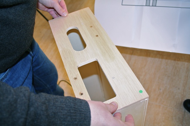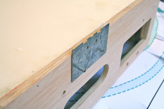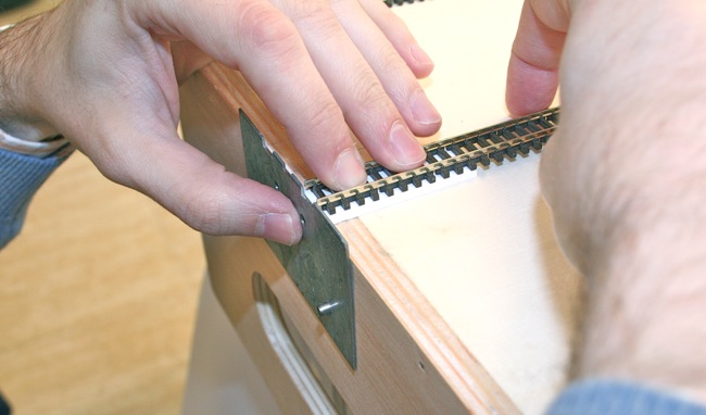 Realizadas las operaciones anteriores, colocaremos en cada uno de estos cabeceros una pieza metálica con la que situaremos correctamente la vía, dicha pieza esta preparada para tal fin, guía y asegura con precisión la vía y al mismo tiempo hace de plantilla, esta plancha de metal la fijaremos a la madera por medio de unos bulones, que introduciremos a través de unos taladros dispuestos para tal fin, observar imagen.