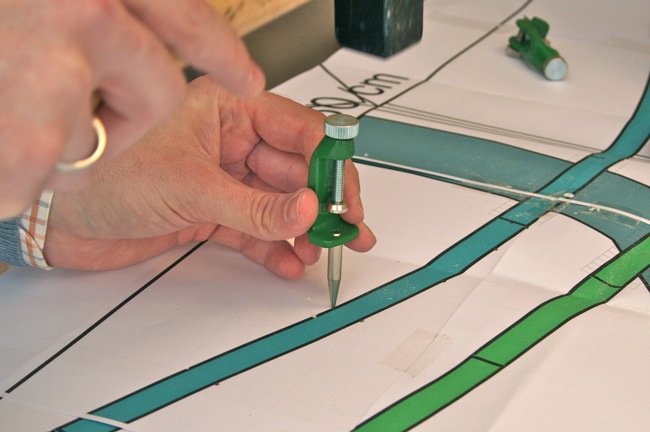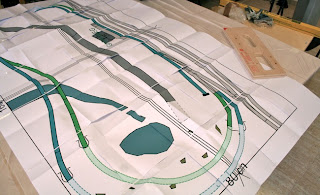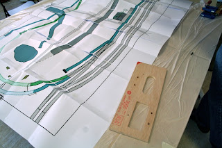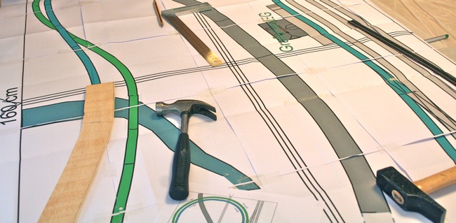 Realizada la operación anterior, podemos marcar sobre la superficie de nuestra estructura modular referencias de la situación del circuito de vías, para ello nos ira muy bien superponer sobre dicha superficie el plano de vías que en su momento se imprimió a escala 1:1 (escala n) y marcar dichas cotas, observar imagen.