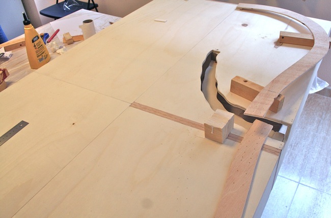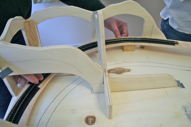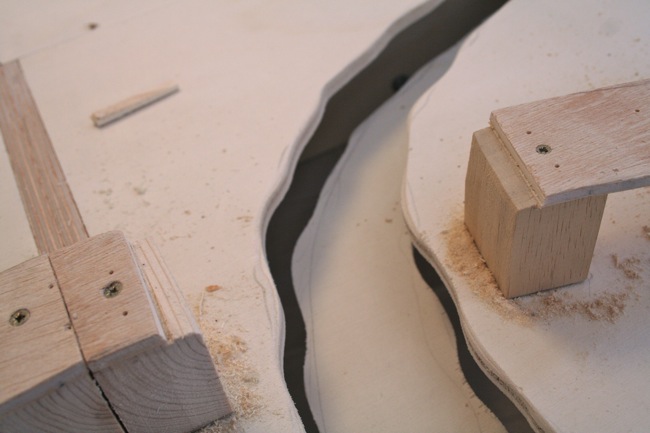 Habiendo preparado, resuelto los pasos anteriores, sin ninguna duda el circuito se va a ajustar perfectamente a nuestra estructura, módulos, su viabilidad es correcta, proporciones, curvas…, ya podemos preparar rampas, presentarlas, para ello deberemos cortar las correspondientes piezas en madera que sustentaran nuestra vía, cortar con la forma adecuada y lijar será en este momento el objetivo, madera de contrachapado por ejemplo de 5 mm servirá.