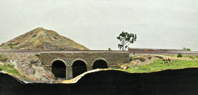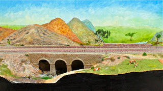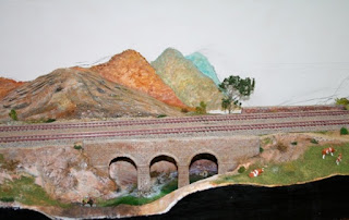 La colocación del bastidor de fondo es sencilla; una vez seleccionada la zona donde queremos que vaya y ya elegido el motivo correspondiente, el cual se deberá adecuar e integrar perfectamente a esa parte, nos pondremos manos a la obra, en este caso es una zona montañosa y de campo atravesadas por un río que a su vez lo cruza el ferrocarril. Vamos a pintar nosotros mismos esa trasera para adaptarla adecuadamente al entorno anteriormente descrito.