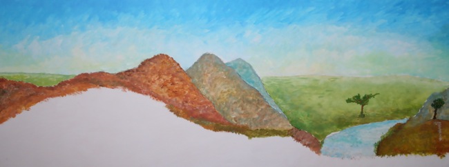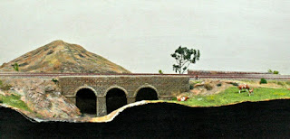 El bastidor de fondo o trasera ya esta terminado, hemos pintado un paisaje sencillo, básico el cual se ajusta a nuestro modulo/maqueta, tiene unas montañas, un poco de campo o valle hemos continuado el río y colocado algún árbol, como es lógico se puede detallar mas pero no nos complicamos, este encuadre nos va a quedar muy bien, la parte que va a tapar el diorama no hace falta que se pinte. En la imagen inferior observamos un detalle de su colocación en la estructura.