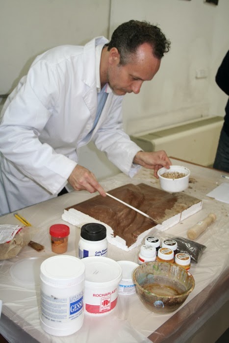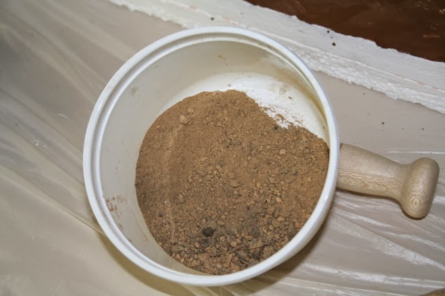 Ahora hay que texturizar la superficie preparada, podemos mezclar tierras o gravas, arcillas, sedimentos, etc. Ira muy bien moler la mezcla anterior, la grava obtenida de esta forma será estupenda.