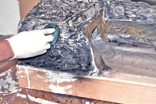 Se va a continuar en este caso con la escayola, también podríamos utilizar el yeso u otros tipos de masillas o pastas. Para este proceso, como también en el anterior, protegeremos las vías. Esta escayola ahora la vamos a aplicar en capas bastante mas gruesas y consistentes que en la vez anterior, es decir, cubriremos esa primera aplicación con la misma escayola pero mas densa, mas espesa, realmente estaremos dando forma por medio de ese engrudo.